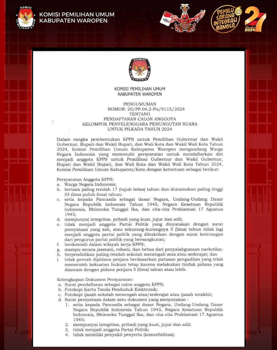 #TemanPemilih, berikut ini kami sampaikan pengumuman Nomor : 20/PP.04.2-Pu/9115/2024, tentang Pendaftaran Calon Anggota Kelompok Penyelenggara Pemungutan Suara (KPPS) untuk Pilkada Tahun 2024.