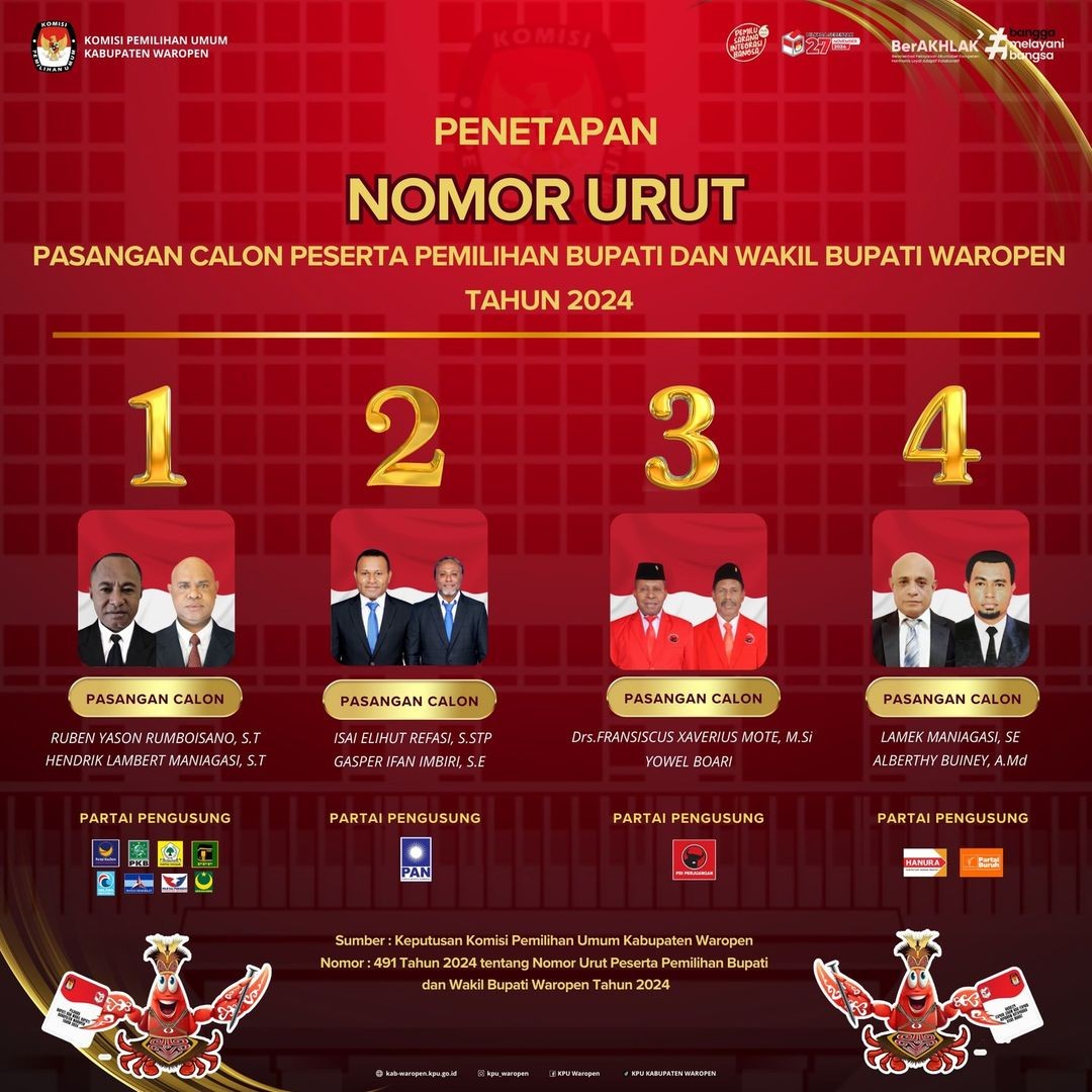 #TemanPemilih, telah menetapkan nomor urut pasangan calon Bupati dan Wakil Bupati Kabupaten Waropen Tahun 2024.