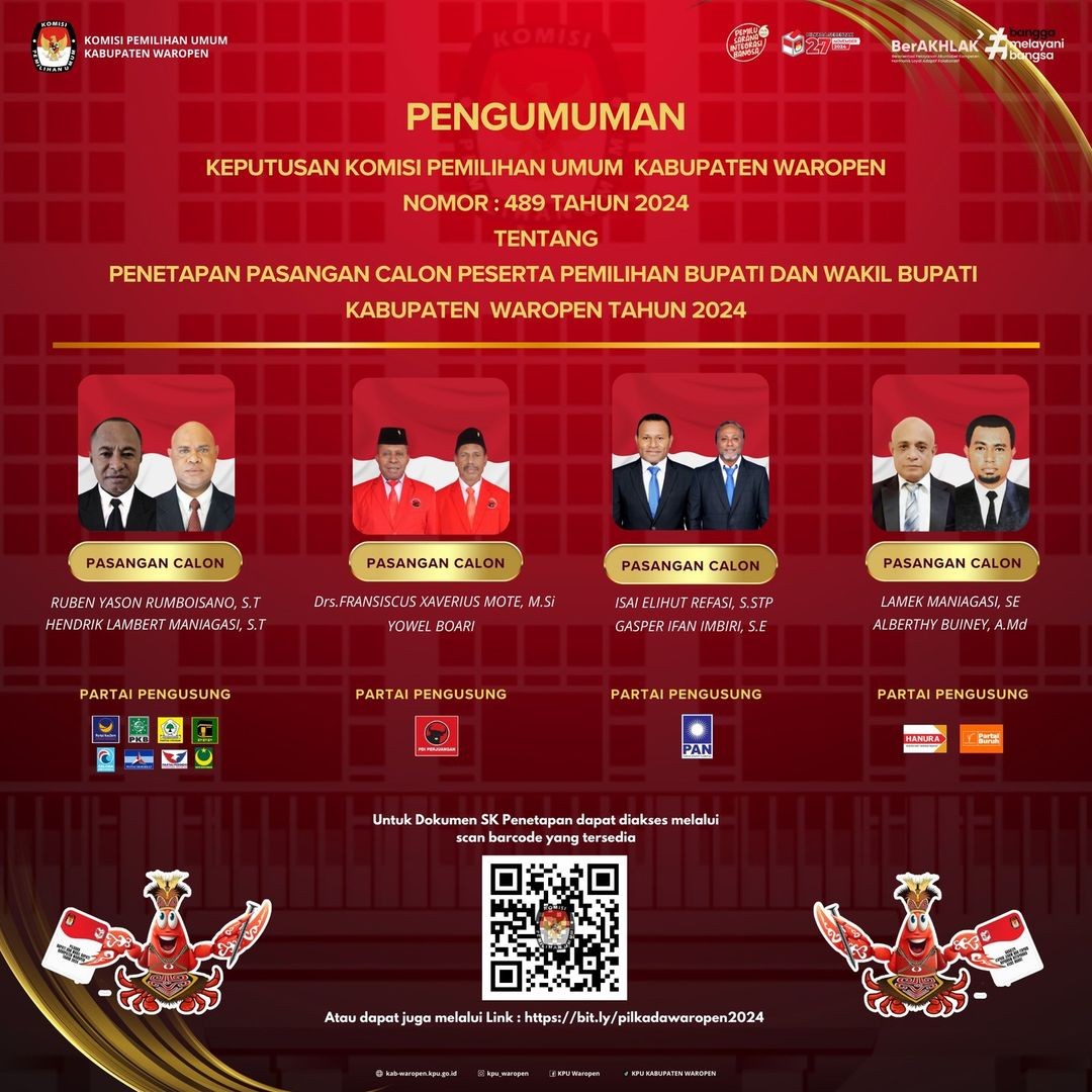 #TemanPemilih, berikut ini kami sampaikan Pengumuman Surat Keputusan Komisi Pemilihan Umum Nomor : 489 Tahun 2024 Tentang Penetapan Pasangan Calon Peserta Pemilihan Bupati Dan Wakil Bupati Kabupaten Waropen Tahun 2024.