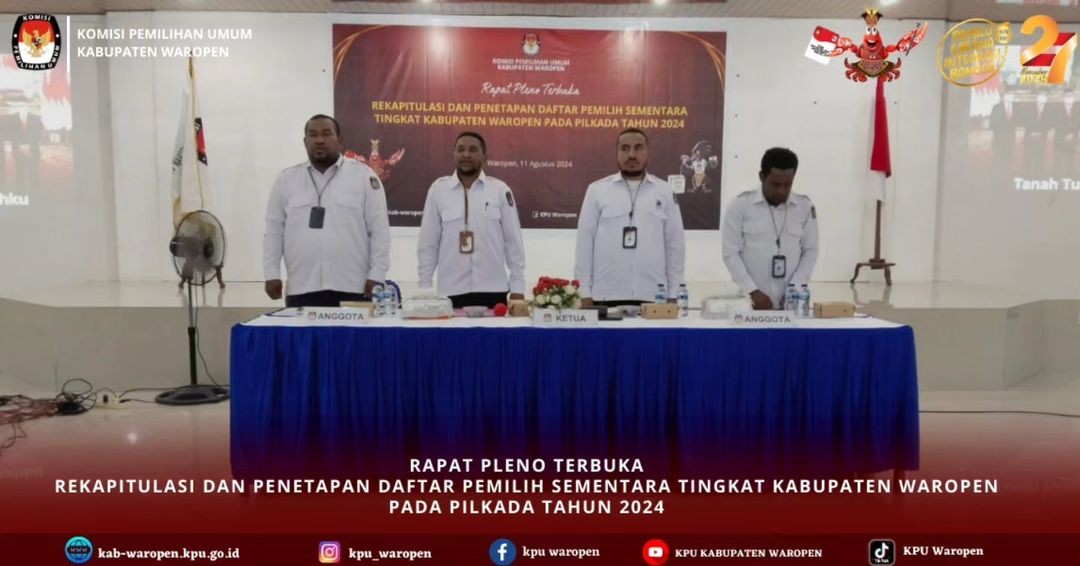 #TemanPemilih, Waropen, 11 Agustus 2024, Komisi Pemilihan Umum (KPU) Kabupaten Waropen menggelar rapat pleno terbuka untuk melakukan rekapitulasi Daftar Pemilih Sementara (DPS) tingkat kabupaten, bertempat di Aula Kantor Klasis GKI Waropen. Acara tersebut dibuka oleh Ketua KPU Waropen, Theofretes Wona.