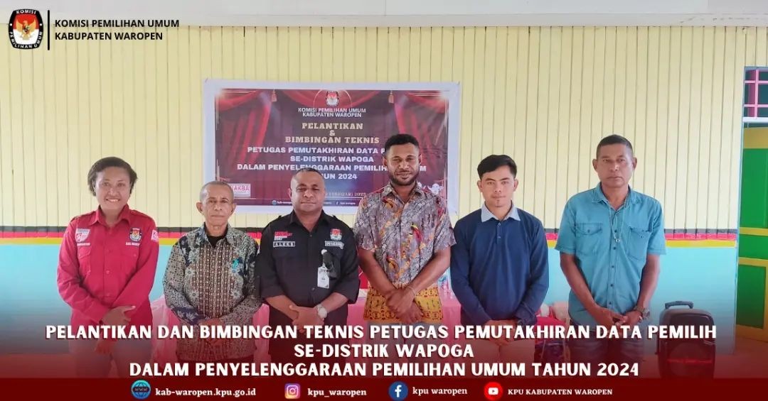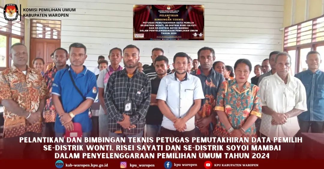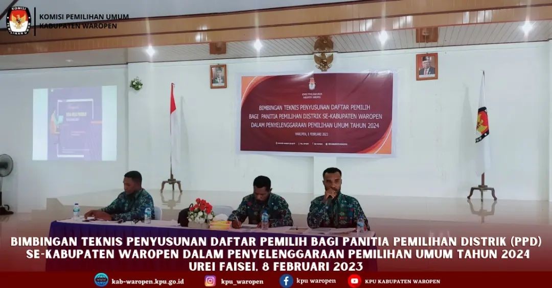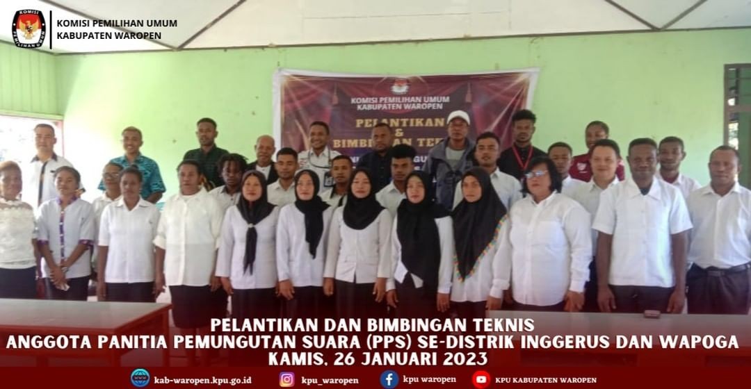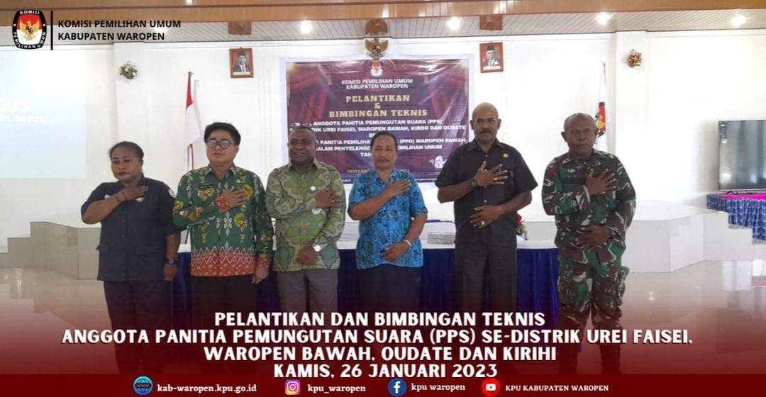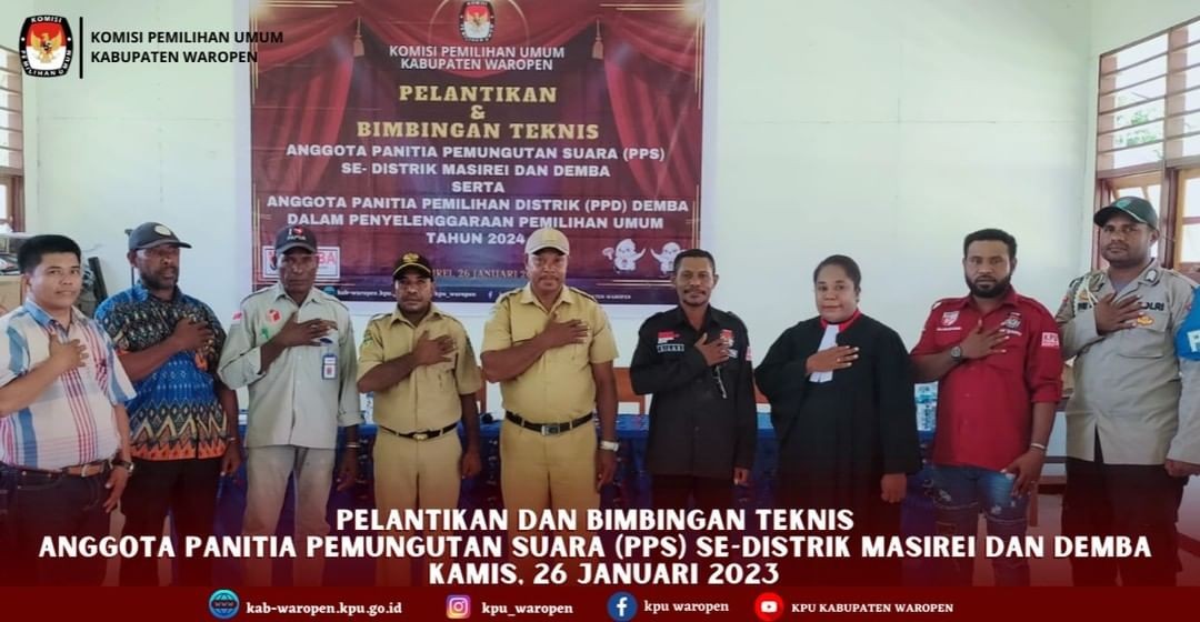 Kamis, 26 Januari 2023 , bertempat di SMP Negeri Koweda, KPU Kabupaten Waropen melaksanakan Pelantikan dan Bimtek bagi Anggota Panitia Pemungutan Suara (PPS) untuk 2 Distrik, diantaranya ; Distrik Masirei dan Distrik Demba, Pelantikan dilakukan Oleh Anggota KPU Kabupaten Waropen, Bapak Silas Y. Buinei, Ketua Divisi Teknis Penyelenggara.