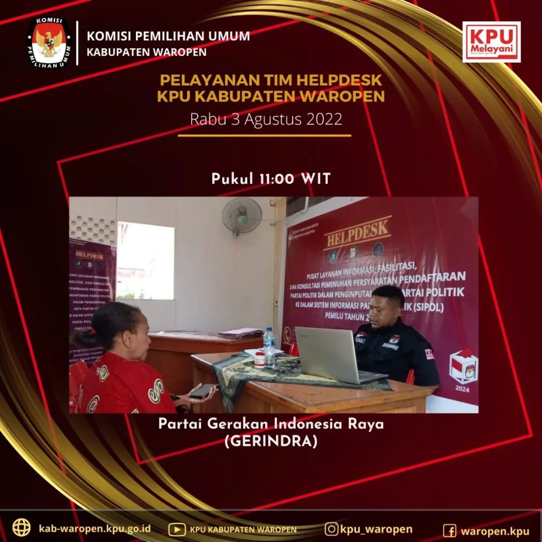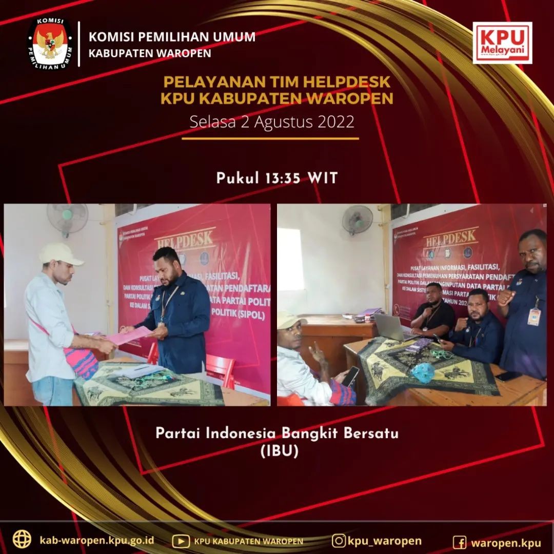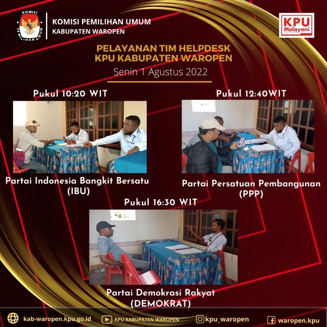Sesuai dengan Jadwal Pendaftaran, Verifikasi dan Penetapan Partai Politik Peserta Pemilu 2024 yang telah berjalan sejak tanggal 1 agustus s/d 14 agustus mendatang, tim Helpdesk KPU Kabupaten Waropen membuka Pusat Pelayanan di ruang Helpdesk, adapun waktu Pelayanan Sejak pukul 08:00 - 17:00 WIT ( setiap hari ).