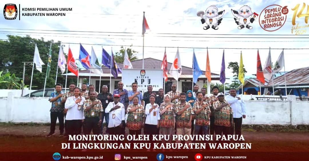 #TemanPemilih, Adam Arisoi Anggota KPU Provinsi Papua Divisi Sosialisasi, Pendidikan Pemilih, dan Pastisipasi Masyarakat bersama Sekretaris KPU Provinsi Papua, Ryllo Ashuri Panay didampingi Staf Kesekretariatan, melakukan Monitoring pada KPU Kabupaten Waropen, Jumat,16 Juni 2023.