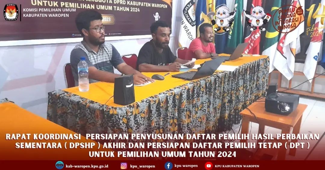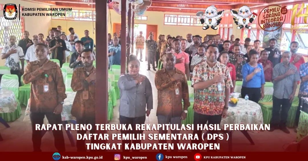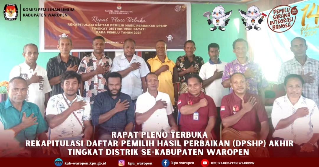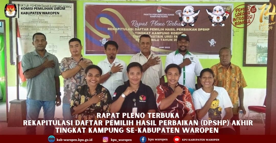 #TemanPemilih, 1-2 Juni 2023 bertempat di balai kampung di tiap Distrik, Panitia Pemungutan Suara (PPS) 100 kampung se-Kabupaten Waropen melaksanakan Rapat Pleno Terbuka Daftar Pemilih Sementara Hasil Perbaikan Akhir ( DPSHP ) Pemilu Tahun 2024, yang dihadiri Kepala Kampung, PKD, Anggota PPD masing-masing distrik dan Para Pengurus Partai Politik Peserta Pemilu 2024. Berdasarkan Peraturan Komisi Pemilihan Umum Nomor 7 Tahun 2023 tentang Perubahan Atas Peraturan Komisi Pemilihan Umum Nomor 2 Tahun 2022 tentang Penyusunan Daftar Pemilih Dalam Penyenggaraan Pemilihan Umum dan Sistem Informasi Data Pemilih serta Surat Keputusan Komisi Pemilihan Umum Nomor 27 Tahun 2023 tentang Pedoman Teknis Penyusunan Daftar Pemilih Dalam Negeri pada Penyelenggaraan Pemilihan Umum. Rapat Pleno Daftar Pemilih Sementara Hasil Perbaikan ( DPSHP ) Akhir dilaksankan oleh 99 kampung per tanggal 1-2 Juni 2023, sementara kampung Daimboa distrik Soyoi Mambai baru dapat melaksanakan Pleno pada tanggal 3 juni 2023 dikerenakan ada sedikit kendala, namun dapat diakomodir sehingga untuk keseluruhan 100 kampung dari 11 Distrik yang ada di Kabupaten waropen telah selesai melaksankan Rapat Pleno Terbuka Daftar Pemilih Sementara Hasil Perbaikan Akhir ( DPSHP ) Untuk Pemilu Tahun 2024. #KPUMelayani #PemiluSerentak2024