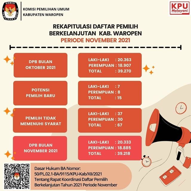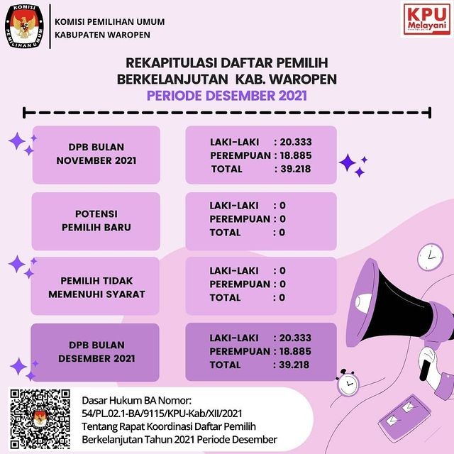 #TemanPemilih - Berikut ini adalah infografis Rekapitulasi Daftar Pemilih Berkelanjutan (DPB) Kabupaten Waropen Periode Desember 2021, terdapat 39.218 pemilih dengan rincian laki-laki sebanyak 20.333 pemilih dan perempuan sebanyak 18.885 pemilih, yang tersebar di 11 Distrik dalam 100 Desa
